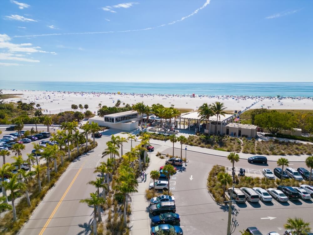 There are over 900 public parking spaces next to the main Siesta Beach park, which is the largest lot of any Siesta Key beach access points. Since this stretch of sand is the most popular and consistently packed in peak season, be sure to arrive earlier in the day so you can snag a parking spot.